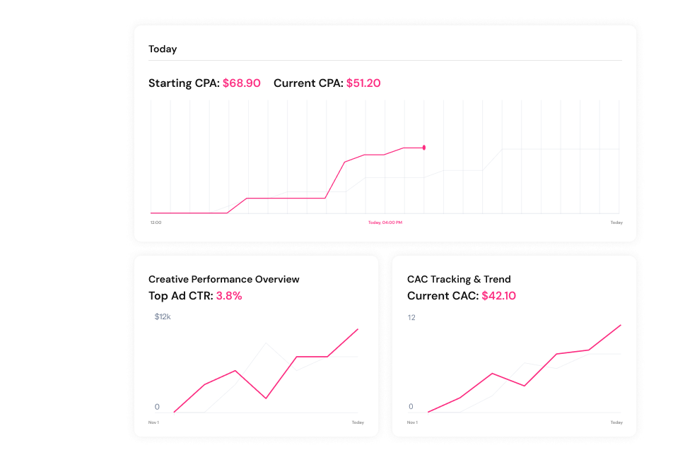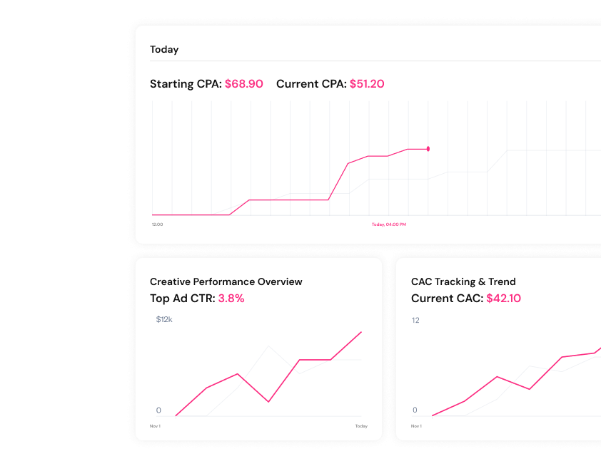 Track your progress through our clear insights: win rates, creative fatigue cycles, and lift percentages — all designed to help you scale confidently and efficiently.